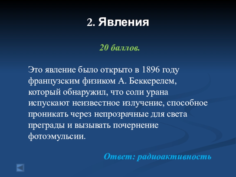 2. Явления20 баллов. Это явление было открыто в 1896 году французским физиком А. Беккерелем, который обнаружил, что соли урана
