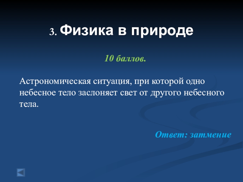 3. Физика в природе10 баллов. Астрономическая ситуация, при которой одно небесное тело заслоняет свет от другого