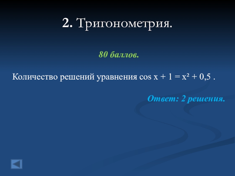2. Тригонометрия. 80 баллов. Количество решений уравнения cos x + 1 = x² + 0,5 .Ответ: 2