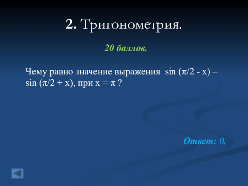2. Тригонометрия.20 баллов. Чему равно значение выражения sin (π/2 - x) – sin (π/2 + x), при