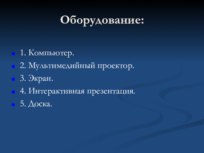 Оборудование:1. Компьютер.2. Мультимедийный проектор.3. Экран.4. Интерактивная презентация.5. Доска.