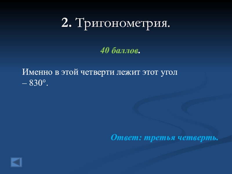 2. Тригонометрия.40 баллов.Именно в этой четверти лежит этот угол  – 830°. Ответ: третья четверть.