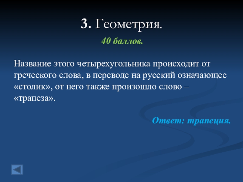 3. Геометрия.40 баллов. Название этого четырехугольника происходит от греческого слова, в переводе на русский означающее «столик», от