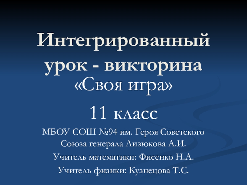 Интегрированный урок - викторина«Своя игра»11 классМБОУ СОШ №94 им. Героя Советского Союза генерала Лизюкова А.И.Учитель математики: Фисенко
