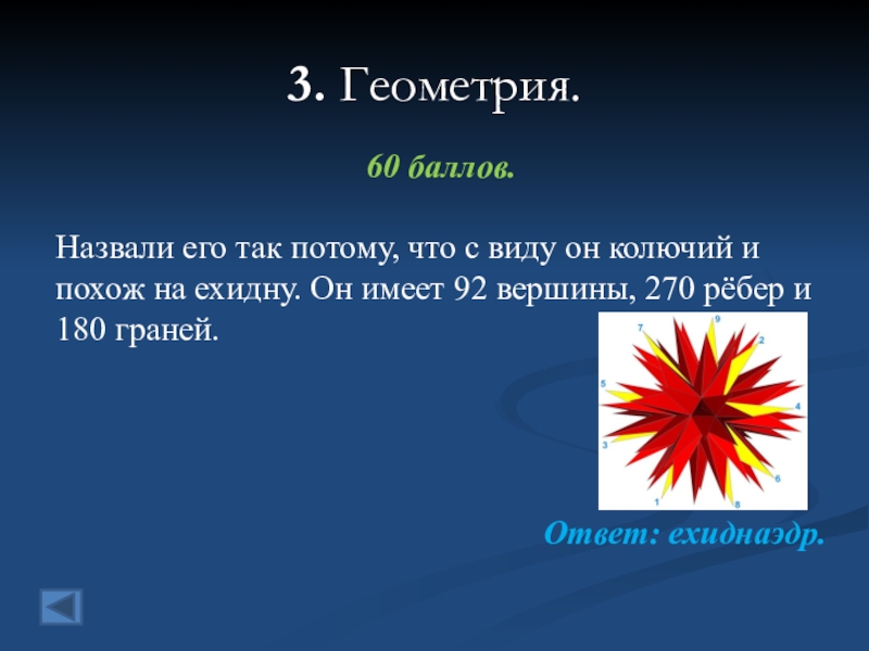 3. Геометрия.60 баллов.Назвали его так потому, что с виду он колючий и похож на ехидну. Он имеет