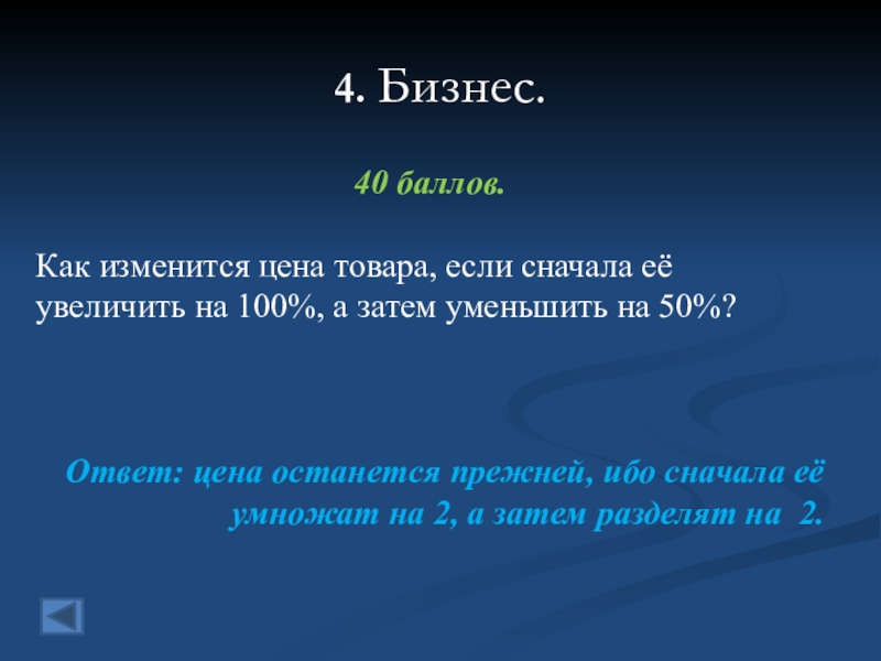 4. Бизнес.40 баллов. Как изменится цена товара, если сначала её увеличить на 100%, а затем уменьшить на