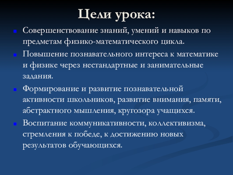 Цели урока:Совершенствование знаний, умений и навыков по предметам физико-математического цикла.Повышение познавательного интереса к математике и физике через нестандартные и занимательные задания.Формирование и развитие познавательной активности школьников, развитие внимания, памяти, абстрактного мышления, кругозора учащихся.Воспитание коммуникативности, коллективизма,  стремления