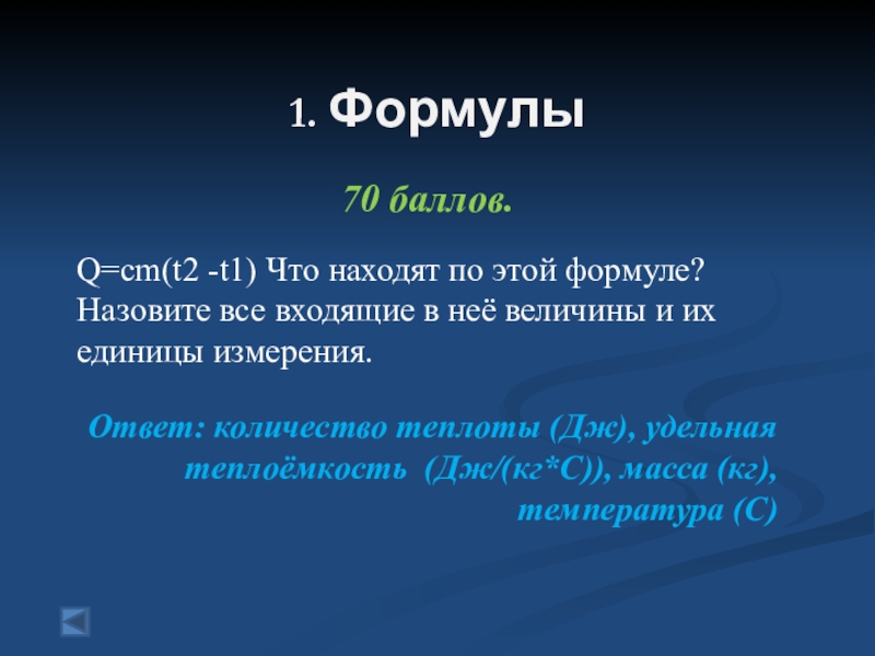 1. Формулы70 баллов. Q=cm(t2 -t1) Что находят по этой формуле? Назовите все входящие в неё величины