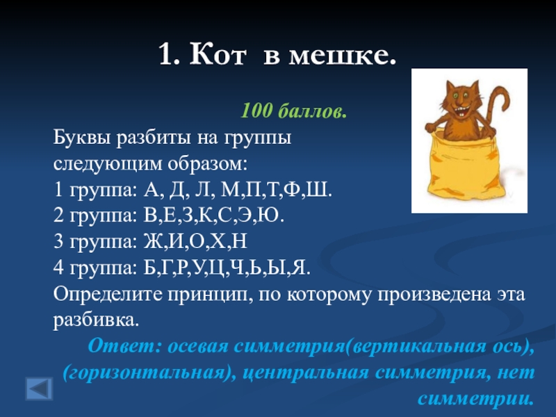 1. Кот в мешке. 100 баллов.Буквы разбиты на группы следующим образом:1 группа: А, Д, Л, М,П,Т,Ф,Ш.2 группа: