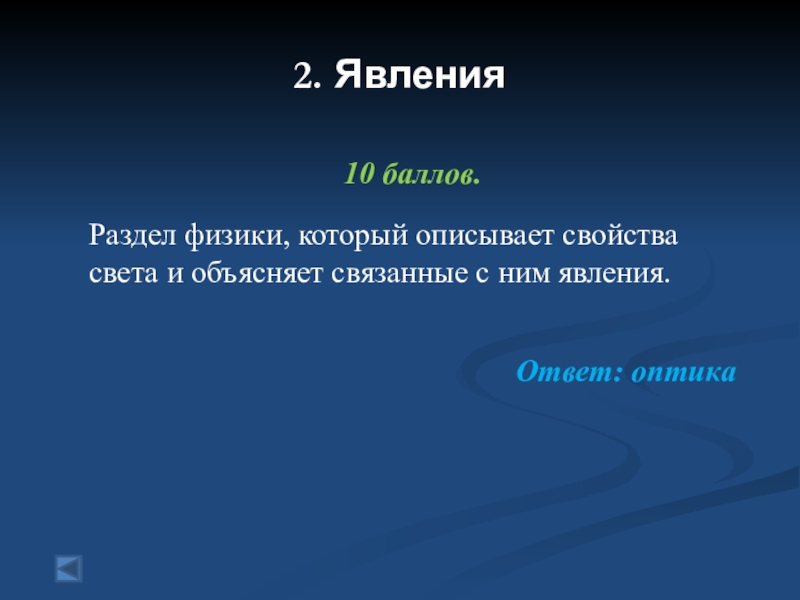 2. Явления10 баллов. Раздел физики, который описывает свойства света и объясняет связанные с ним явления. Ответ: оптика
