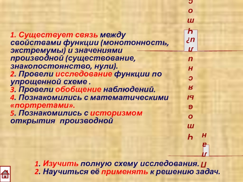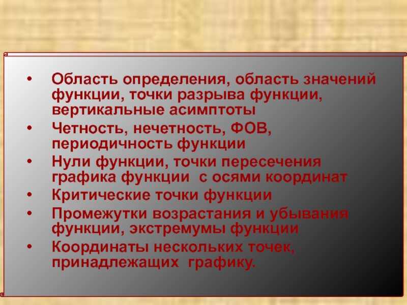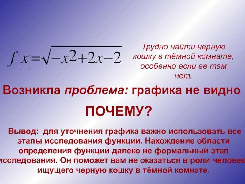 Вывод: для уточнения графика важно использовать все этапы исследования функции. Нахождение области определения функции далеко не формальный этап исследования. Он поможет вам не оказаться в роли человека, ищущего черную кошку в тёмной комнате.