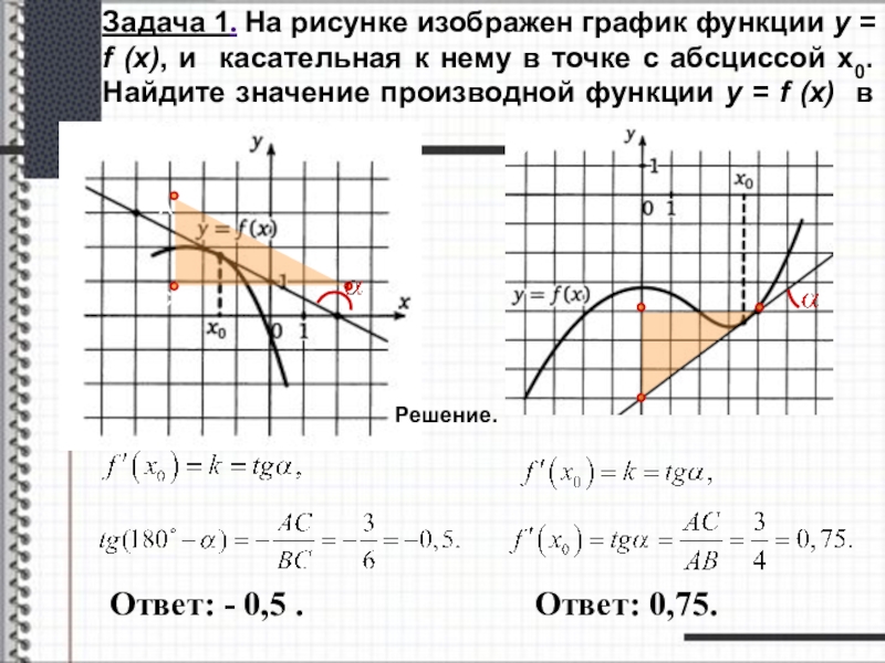 1). Угол, который составляет касательная с положительным направлением оси Ох, тупой. Значит, значение производной в точке х0 отрицательно.