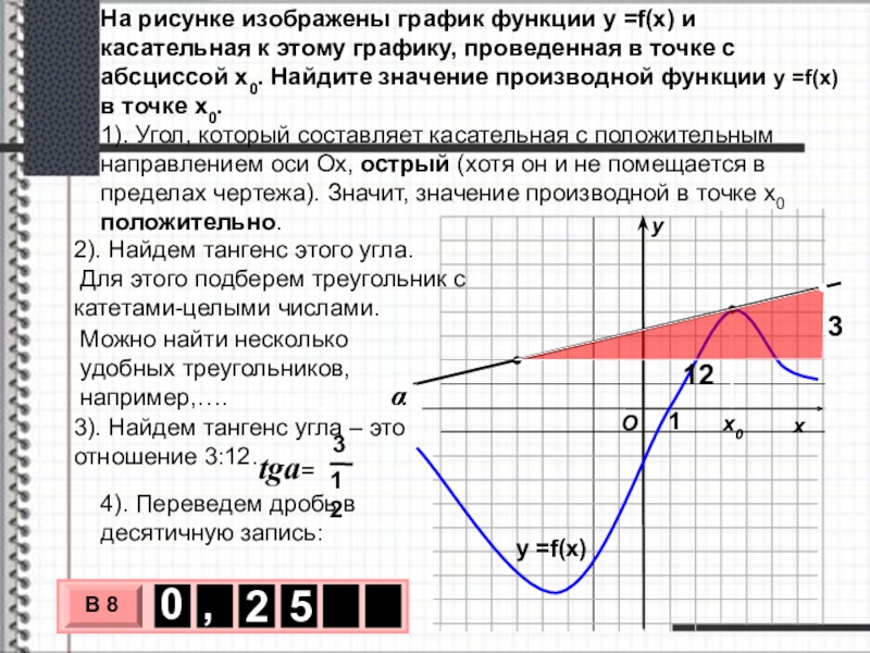 1). Угол, который составляет касательная с положительным направлением оси Ох, острый (хотя он и не помещается в пределах чертежа). Значит, значение производной в точке х0 положительно.