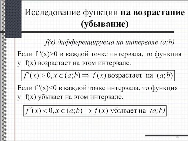 Если f ′(x)<0 в каждой точке интервала, то функция y=f(x) убывает на этом интервале.