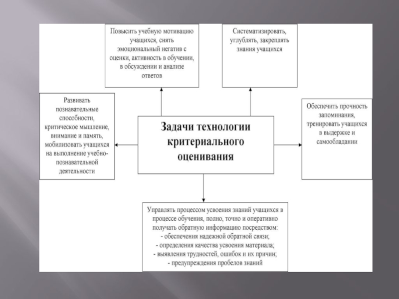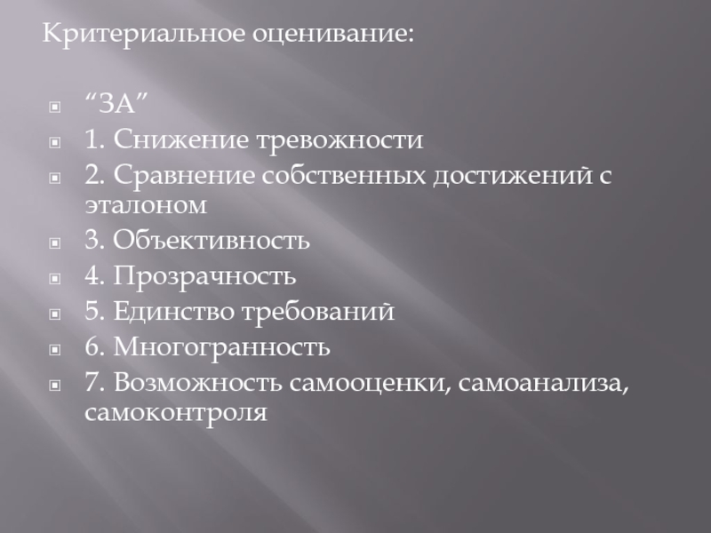 Критериальное оценивание:“ЗА”1.	Снижение тревожности2.	Сравнение собственных достижений с эталоном3.	Объективность4.	Прозрачность5.	Единство требований6.	Многогранность7.	Возможность самооценки, самоанализа, самоконтроля