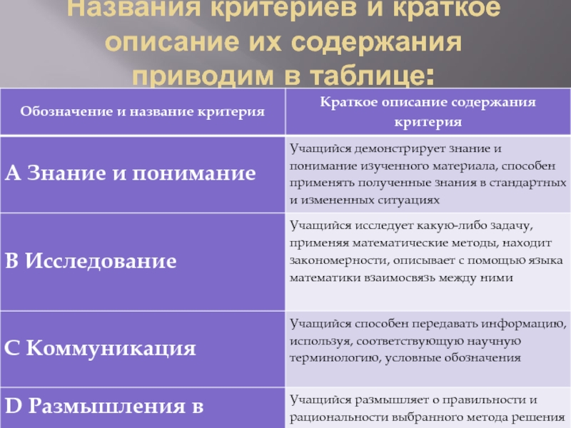 Слайд 6Названия критериев и краткое описание их содержания приводим в таблице: