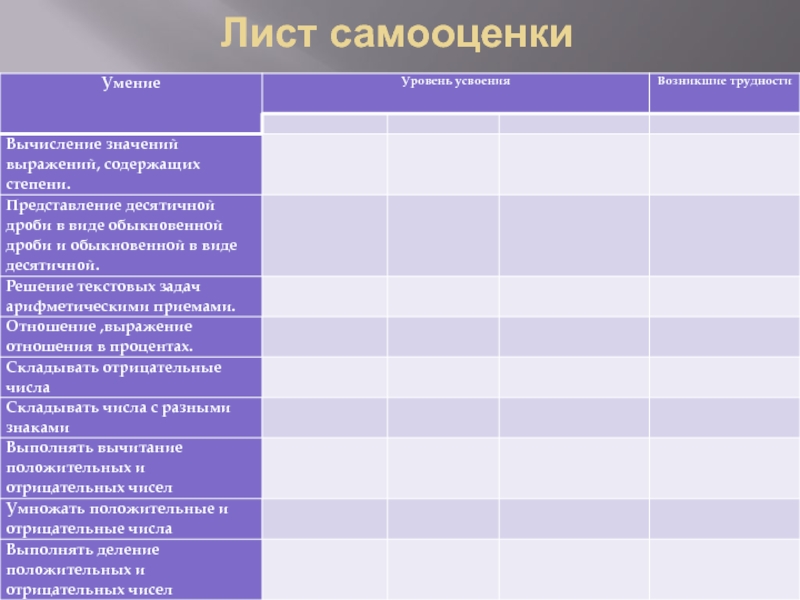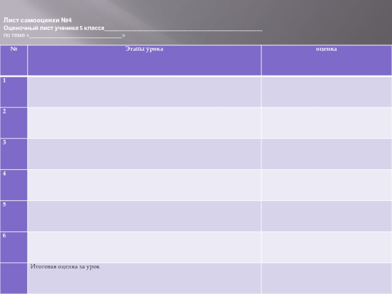 Лист самооценки №4Оценочный лист ученика 5 класса_____________________________________________________по теме «_______________________________»