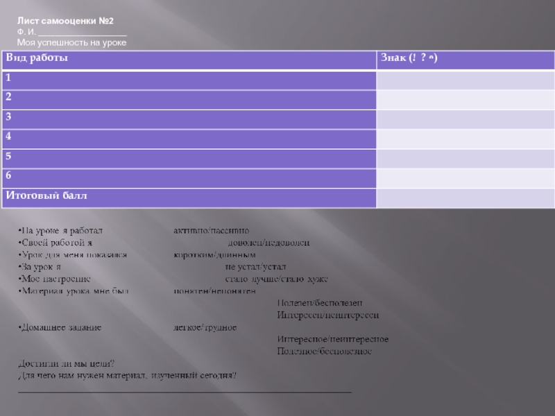 Лист самооценки №2Ф. И. _____________________Моя успешность на уроке