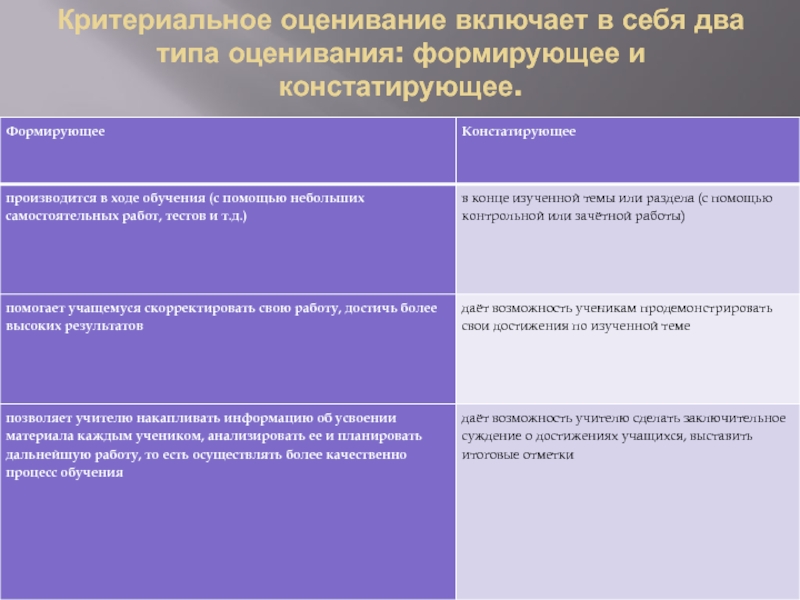 Критериальное оценивание включает в себя два типа оценивания: формирующее и констатирующее.
