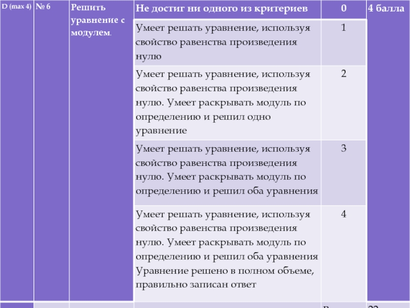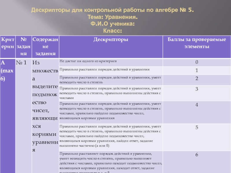Слайд 16 Дескрипторы для контрольной работы по алгебре № 5. Тема: Уравнения. Ф.И.О ученика: