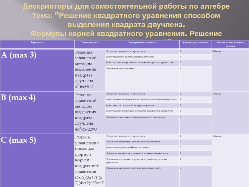 Слайд 14Дескрипторы для самостоятельной работы по алгебре Тема: "Решение квадратного уравнения способом
