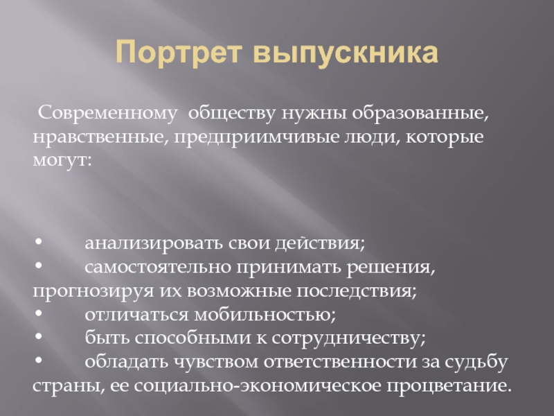 Портрет выпускника Современному  обществу нужны образованные, нравственные, предприимчивые люди, которые могут: •        анализировать свои действия; •