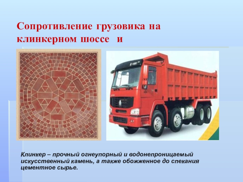 Слайд 11Сопротивление грузовика на клинкерном шоссе и