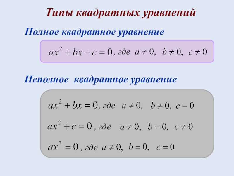 Типы квадратных уравненийПолное квадратное уравнение Неполное квадратное уравнение
