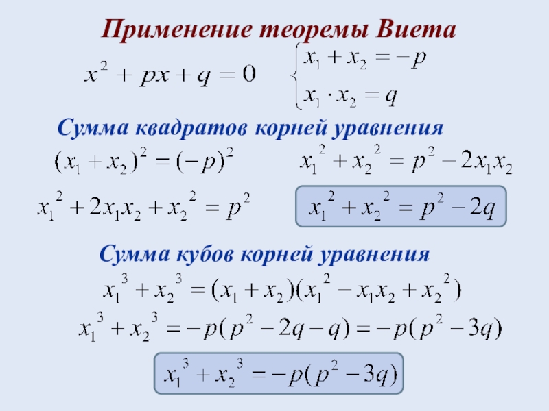 Применение теоремы ВиетаСумма квадратов корней уравненияСумма кубов корней уравнения