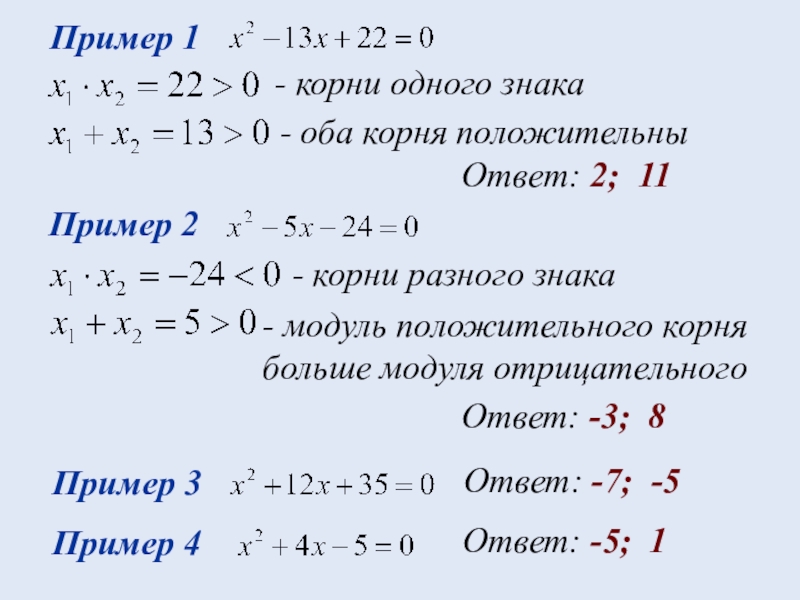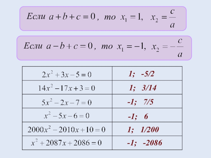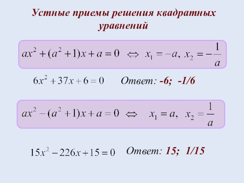 Устные приемы решения квадратных уравненийОтвет: -6; -1/6   Ответ: 15; 1/15