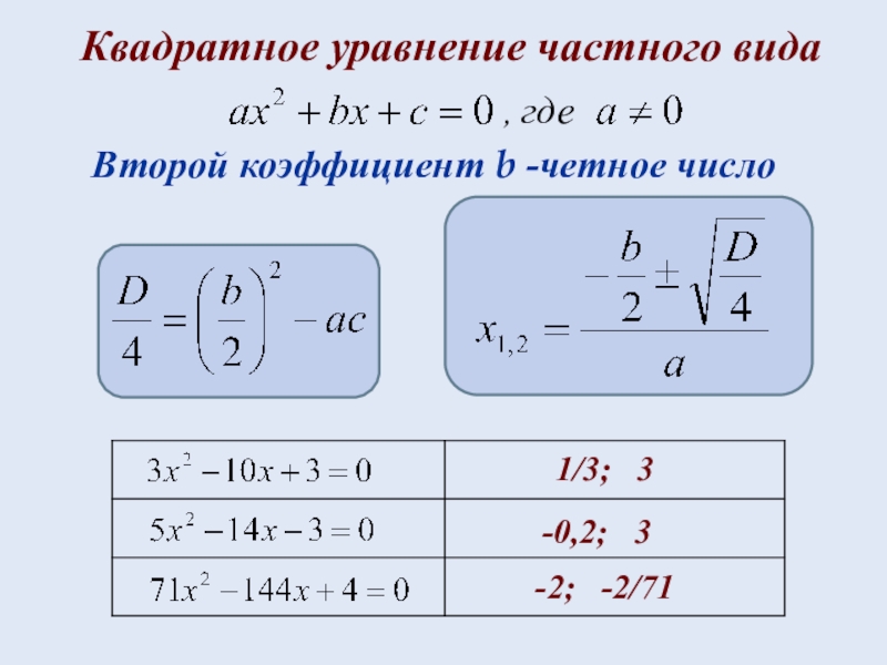 Квадратное уравнение частного видаВторой коэффициент b -четное число1/3;  3-0,2;  3-2;  -2/71