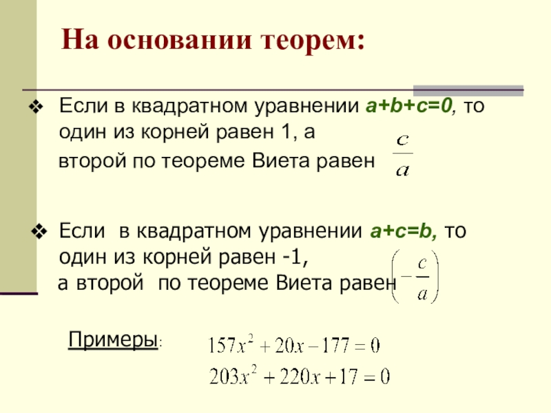 Если в квадратном уравнении a+c=b, то один из корней равен -1,