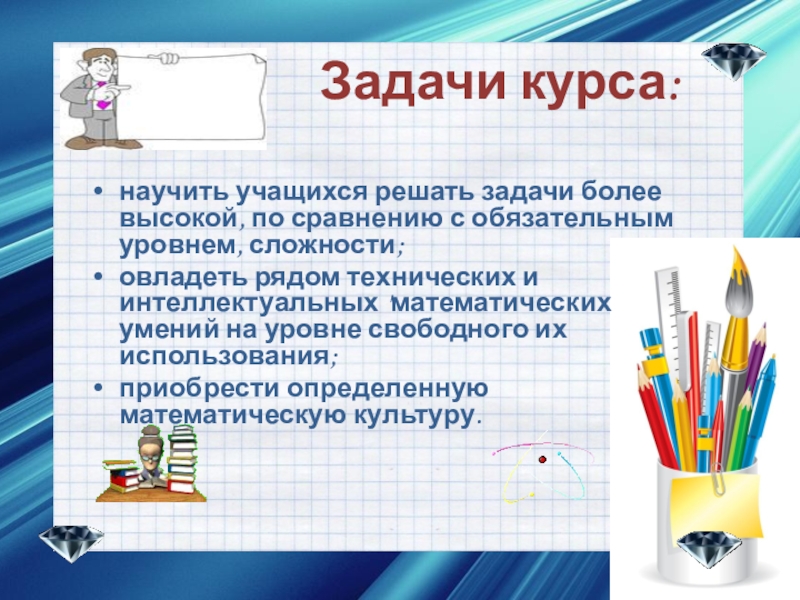 Задачи курса:  научить учащихся решать задачи более высокой, по сравнению с обязательным уровнем, сложности; овладеть рядом
