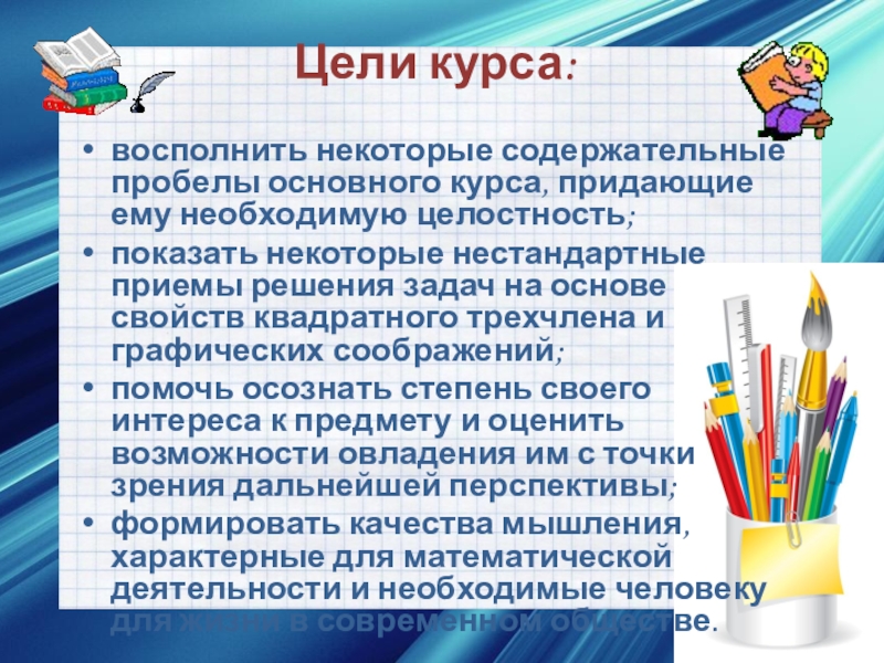 Цели курса:  восполнить некоторые содержательные пробелы основного курса, придающие ему необходимую целостность; показать некоторые нестандартные приемы