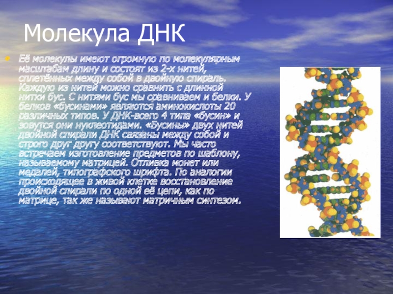 из 2-х нитей, сплетённых между собой в двойную спираль. Каждую из нитей можно сравнить с длинной нитки бус. С нитями бус мы сравниваем и белки. У белков «бусинами» являются аминокислоты 20 различных типов. У ДНК-всего 4 типа «бусин» и зовутся они нуклеотидами. «Бусины» двух нитей двойной спирали ДНК связаны между собой и строго друг другу соответствуют. Мы часто встречаем изготовление предметов по шаблону, называемому матрицей. Отливка монет или медалей, типографского шрифта. По аналогии происходящее в живой клетке восстановление двойной спирали по одной её цепи, как по матрице, так же называют матричным синтезом.