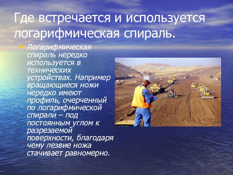 Где встречается и используется логарифмическая спираль.Логарифмическая спираль нередко используется в технических устройствах. Например вращающиеся ножи нередко имеют