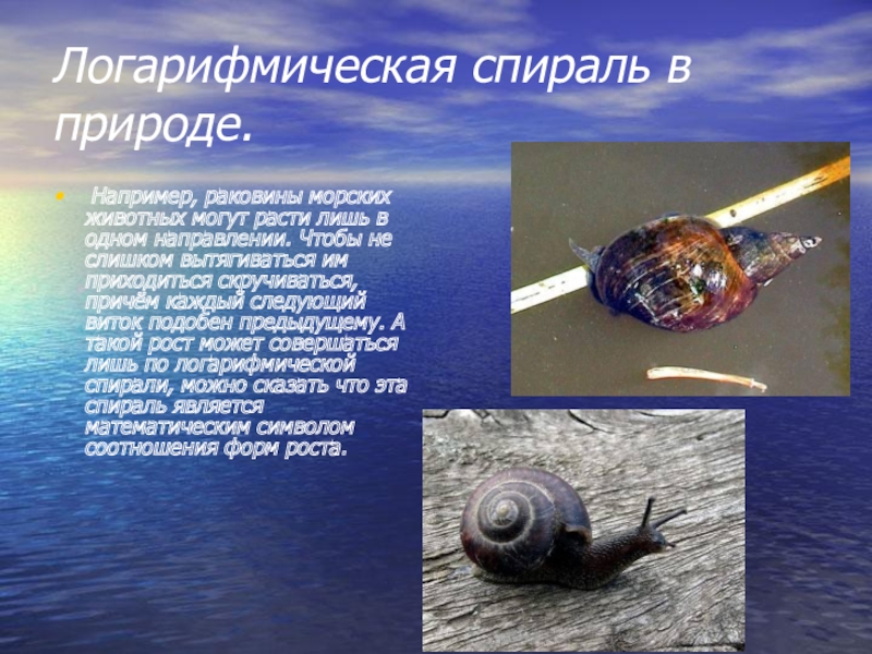 Логарифмическая спираль в природе. Например, раковины морских животных могут расти лишь в одном направлении. Чтобы не слишком