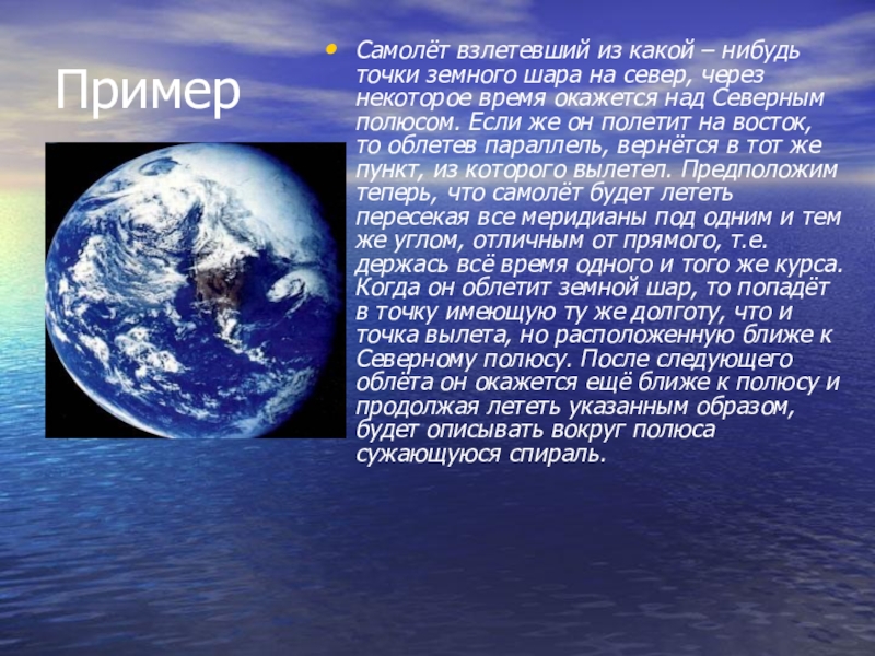 Пример Самолёт взлетевший из какой – нибудь точки земного шара на север, через некоторое время окажется над