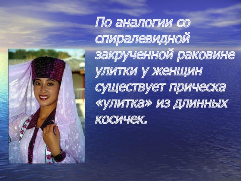 Слайд 10По аналогии со спиралевидной закрученной раковине улитки у женщин существует прическа