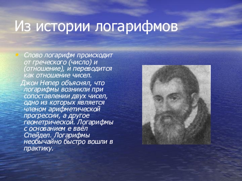 Из истории логарифмовСлово логарифм происходит от греческого (число) и (отношение), и переводится как отношение чисел.  Джон