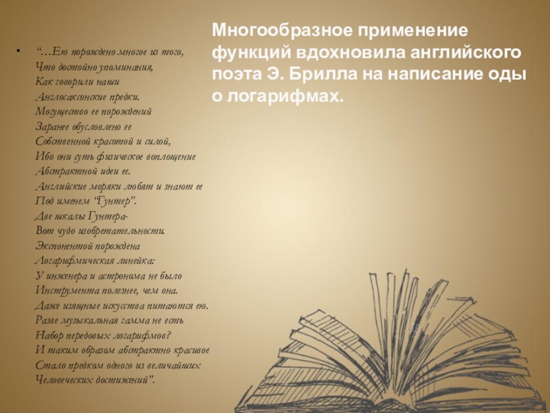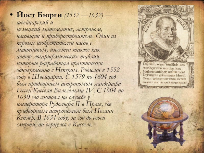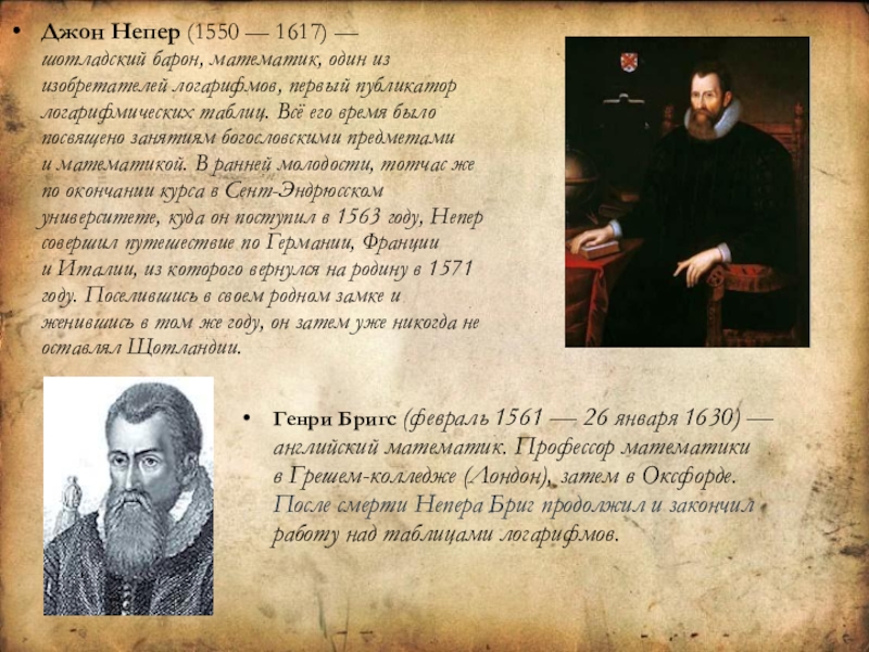 Джон Непер (1550 — 1617) — шотладский барон, математик, один из изобретателей логарифмов, первый публикатор логарифмических таблиц. Всё его время было посвящено занятиям богословскими предметами и математикой. В ранней молодости, тотчас же по окончании курса в Сент-Эндрюсском университете, куда он поступил в 1563 году, Непер совершил путешествие по Германии, Франции и Италии, из которого вернулся на родину в 1571 году. Поселившись в своем родном замке и женившись в том же году, он затем уже никогда не оставлял Щотландии.