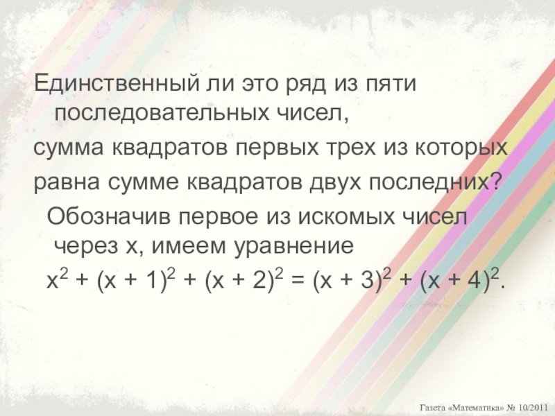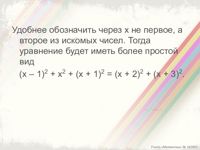 (x – 1)2 + x2 + (x + 1)2 = (x + 2)2 + (x + 3)2.
