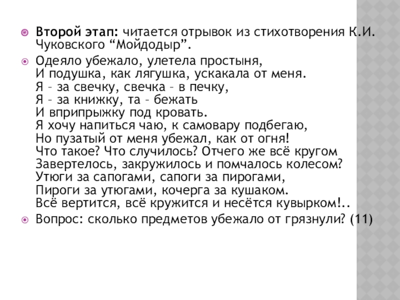 Слайд 16Второй этап: читается отрывок из стихотворения К.И.Чуковского “Мойдодыр”.