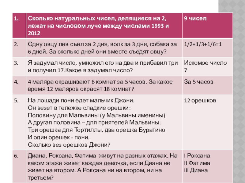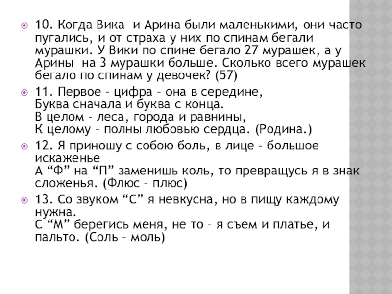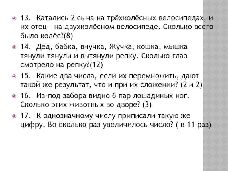 - Сколько рогов у трех коров? (6)
