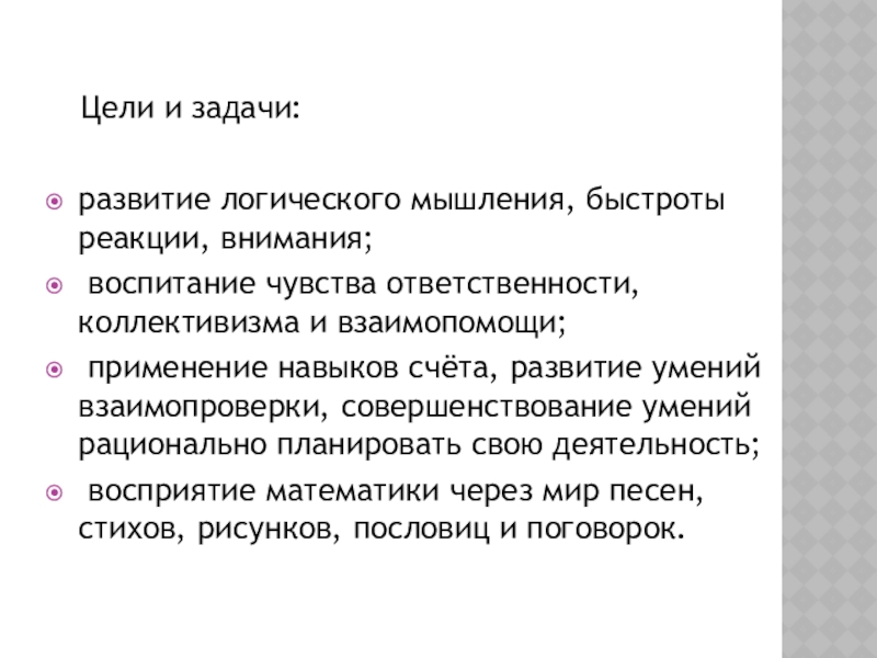 восприятие математики через мир песен, стихов, рисунков, пословиц и поговорок.