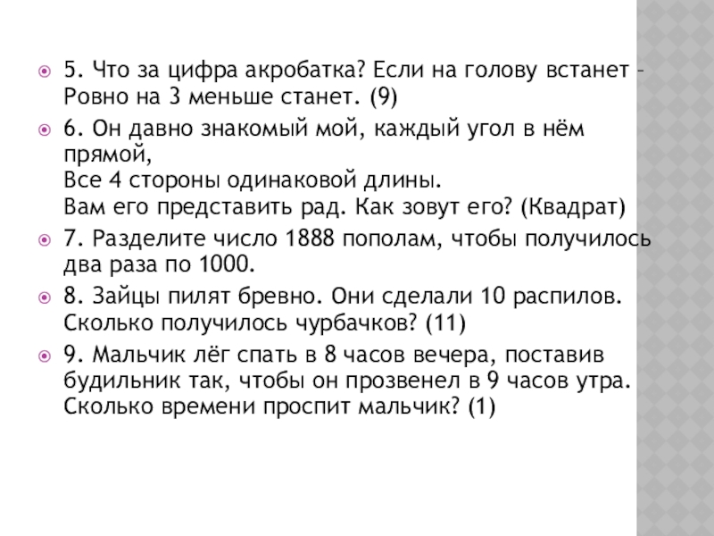 9. Мальчик лёг спать в 8 часов вечера, поставив будильник так, чтобы он прозвенел в 9 часов утра. Сколько времени проспит мальчик? (1)