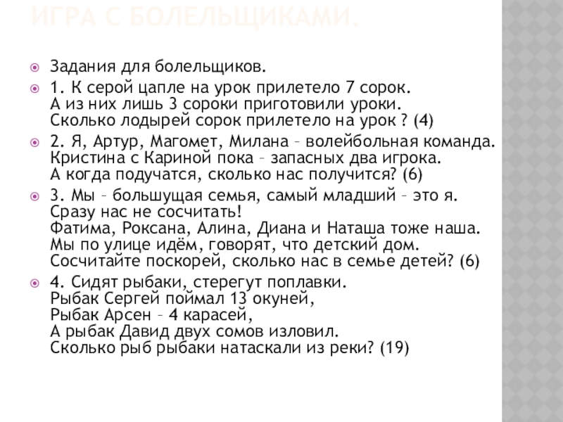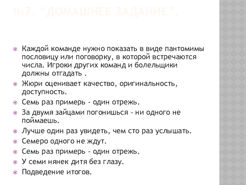 поговорку, в которой встречаются числа. Игроки других команд и болельщики должны отгадать .