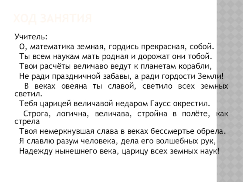 О, математика земная, гордись прекрасная, собой.