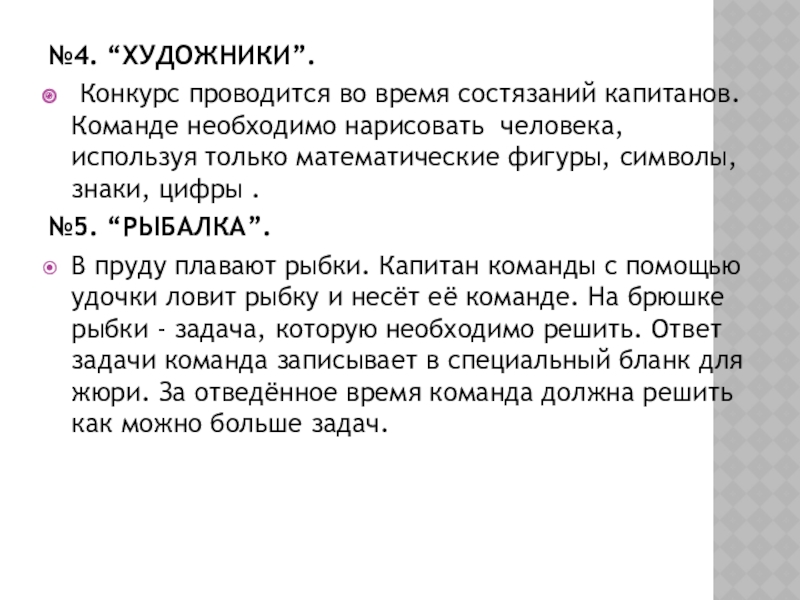 В пруду плавают рыбки. Капитан команды с помощью удочки ловит рыбку и несёт её команде. На брюшке рыбки - задача, которую необходимо решить. Ответ задачи команда записывает в специальный бланк для жюри. За отведённое время команда должна решить как можно больше задач.
