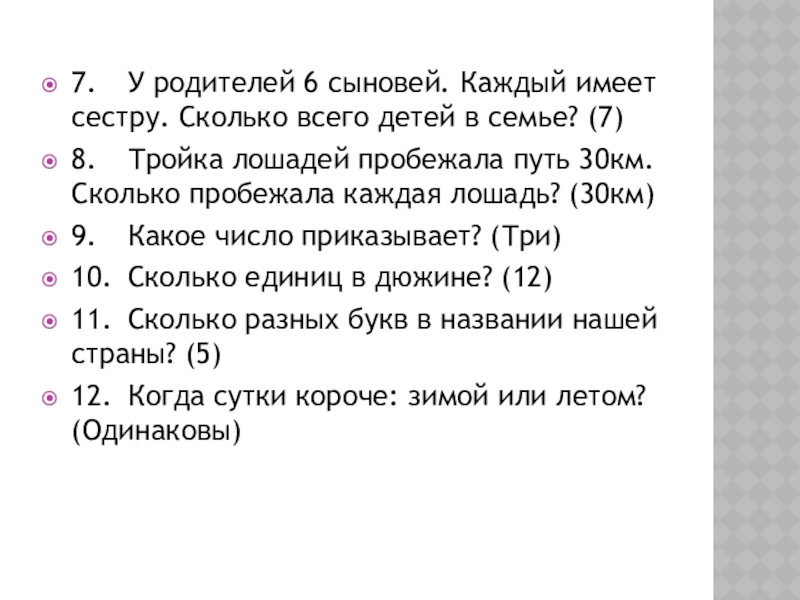 8. Тройка лошадей пробежала путь 30км. Сколько пробежала каждая лошадь? (30км)